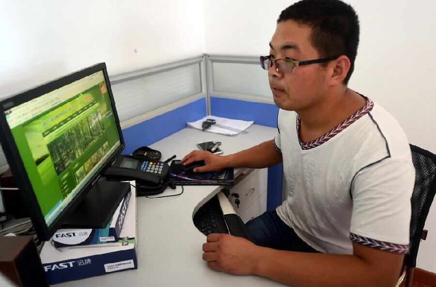 Wang checks the Internet sales of his saplings, Aug. 5, 2015. (Xinhua/Li Xiaoguo)