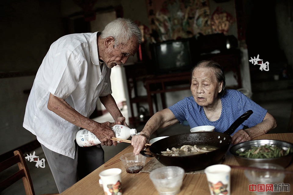 Qin Qiurong pours Qin Suansao a drink; Qiu Suansao puts Qin's favorite dish in front of him. (China.com.cn/Liu Jiaoqing)