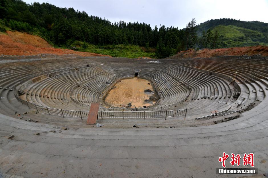 An bullring, covering an area of more than 20,000 square meters, is being built in Rongjiang county, southwest China's Guizhou province on August 7th, 2015. It is the largest bullring for 72 Dong stockaded villages and is built to carry forward traditional Dong bullfight culture. The bullring is said to be able to accommodate 50,000 people and will be put into use this September. (Photo/CNS)