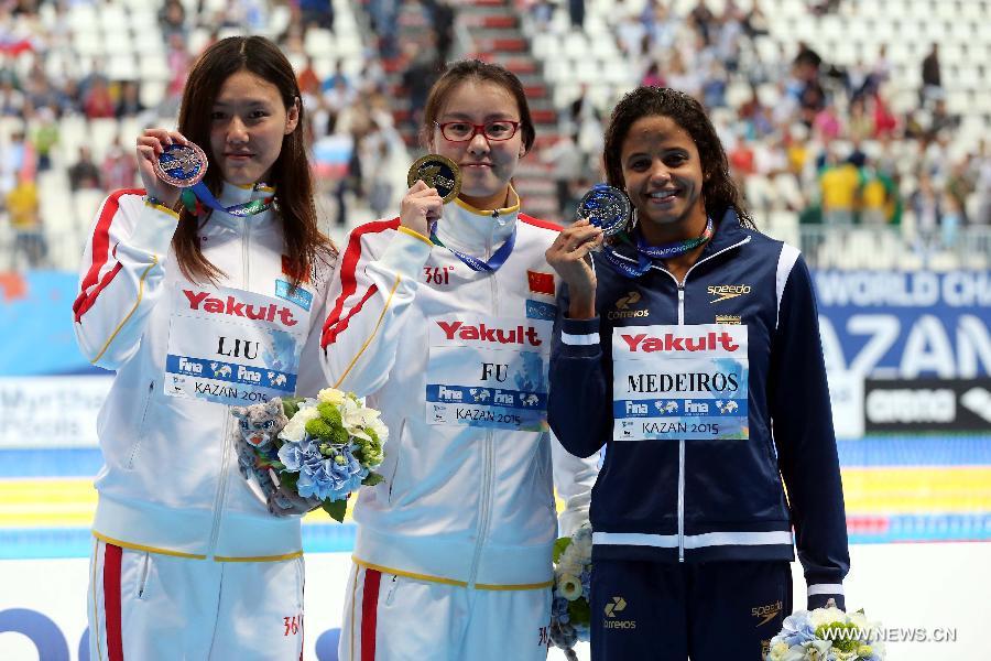 (From L to R) Silver medalist Etiene Medeiros of Brazil, gold medalist Fu Yuanhui of China and bronze medalist Liu Xiang of China pose during the awarding ceremony for the women's 50m backstroke final at the 2015 FINA World Championships in Kazan, Russia, Aug. 6, 2015.(Xinhua/Meng Yongmin) |