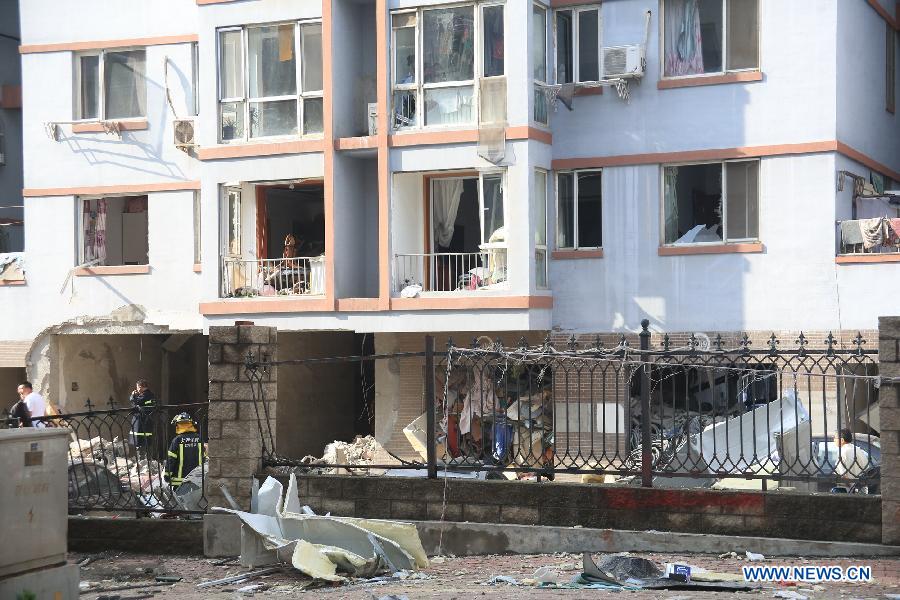 Photo taken on Aug. 7, 2015 shows the accident site after liquified gas exploded at an apartment building in Ganjingzi District of Dalian city, northeast China's Liaoning Province. One person died and six others were injured in the explosion which occurred at noon on Friday. (Xinhua)