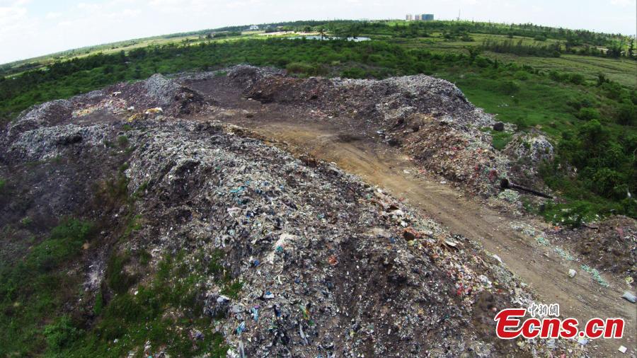 Garbage piles up at a site in Jinshan town of Wenchang city, South China’s Hainan province, Aug 6, 2015. The garbage has been left there for more than 20 years without being processed, rising to meters in height and emitting a terrible smell. Viewed from the air, it looks like a giant scar in a field of green plants. (Photo: China News Service/Wang Xiaobin)