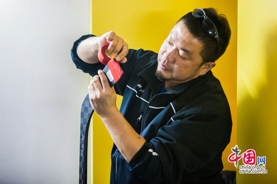 The coach of Huzai Hockey Club does maintenance and repair of the little players' equipment. (China.com.cn/Zheng Liang)