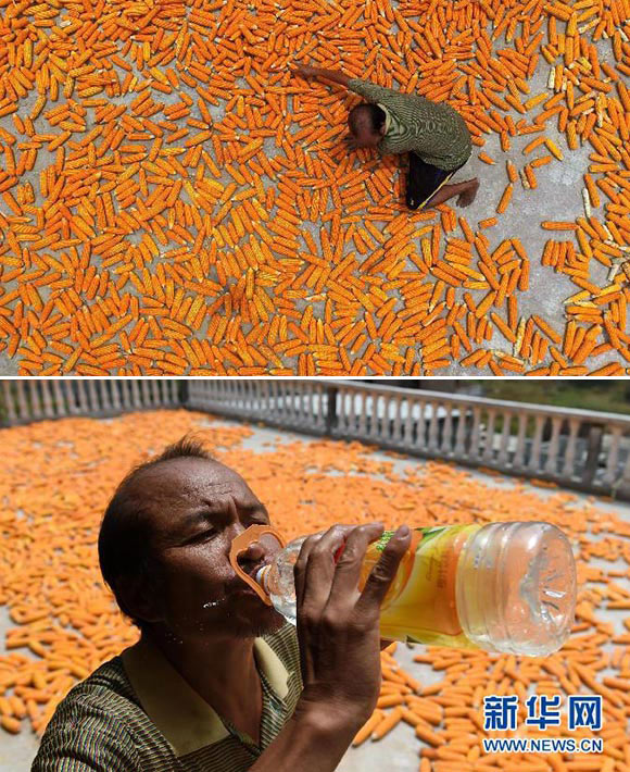 Lan Yufa, 50, is a farmer in Nongyong village, Bansheng country, Guangxi. The summer harvest of 0.2 hectare of corns every year often takes Lan and his wife over half a month to reap. Lan Yufa says jokingly: “What we are reaping are corns and in such hot weather, we ourselves will become pop corns soon.”