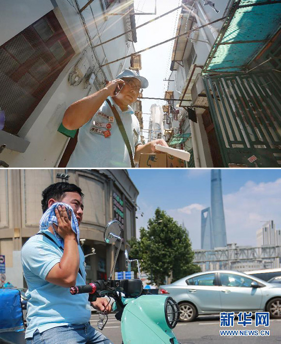 below: On July 28, due to the hot weather, Wang Ziming wipes the sweat on his way of delivery. (Photo from Xinhua)
