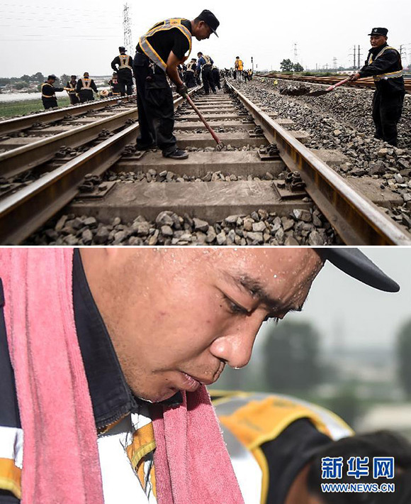 Huang Yasong, 34, is a lineman of Changchun section in Shenyang Railway Bureau. He had to check the railroad inch by inch in heavy work coat under scorching sun to ensure the transportation safety in summer. Huang Yasong would pour some water in his helmet if he failed to stand the hot weather.