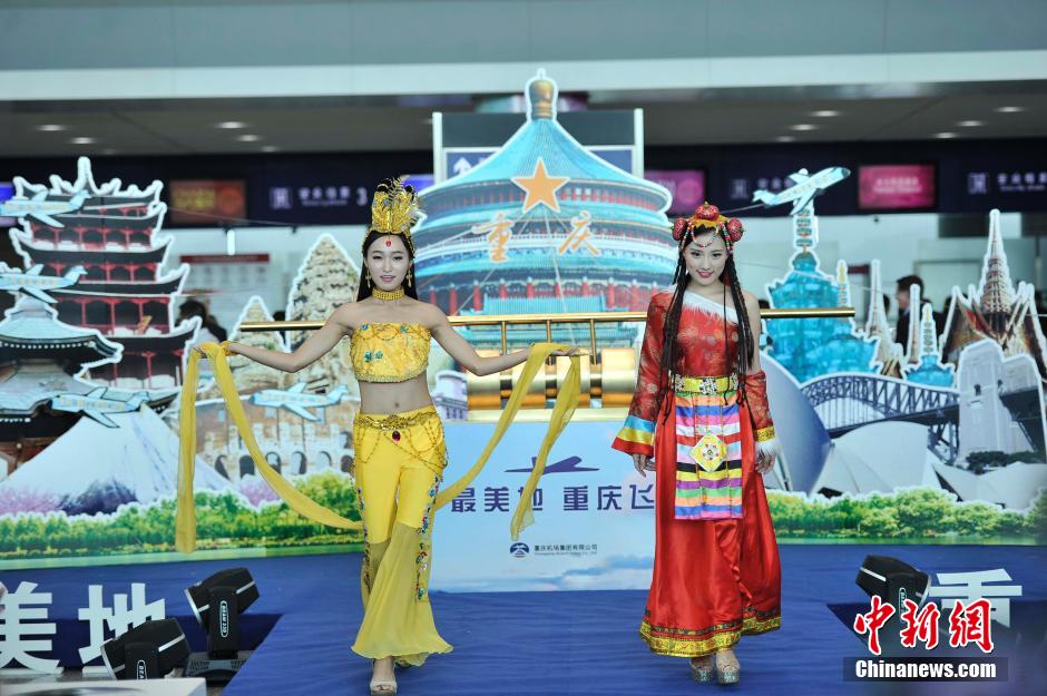 A live show of microlandschafts of popular travel destinations is held in Chongqing airport on Aug. 6, 2015. Beauties in ethnic costumes show microlandschafts in Chongqing, South Korea, Japan, Rome, Thailand, Dunhuang, Harbin, Tibet and other places in the world. (Photo by China News Agency/ Chen Chao)