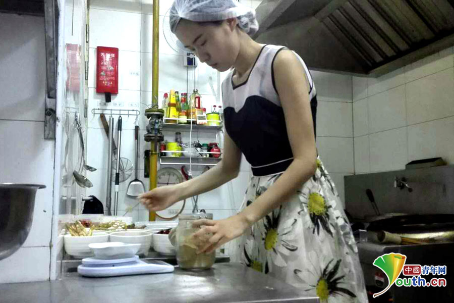 Yan Yingxin busily works in the kitchen. (Youth.cn/Wang Jing)