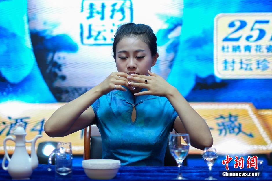 A beautiful female wine taster displayed how to taste Chinese spirits during an event in Zunyi, Guizhou on Aug. 8, 2015. The event attracted a lot of attentions from local citizens.