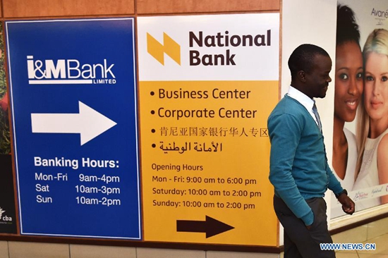 A man walks past a sign of the new branch of National Bank of Kenya which hosts a clearing house for Chinese renminbi (RMB) in Nairobi, Kenya, July 23, 2015.(Xinhua/Sun Ruibo) |