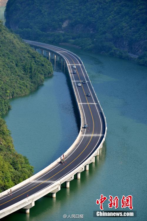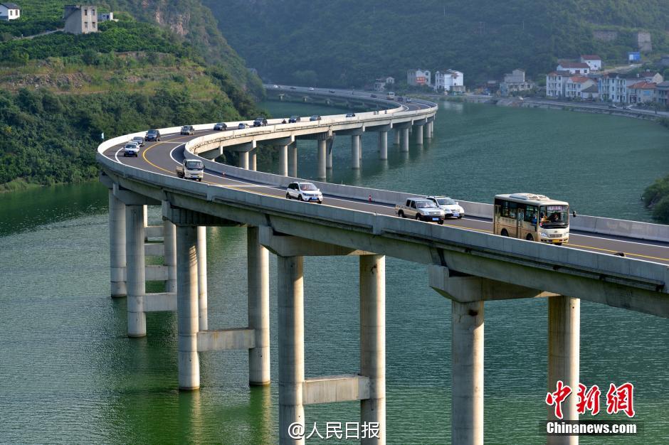 A new highway in Hubei Province opened to traffic on Sunday. Around 4.4 kilometers of the 10.9-kilometer-long highway is built over water.
