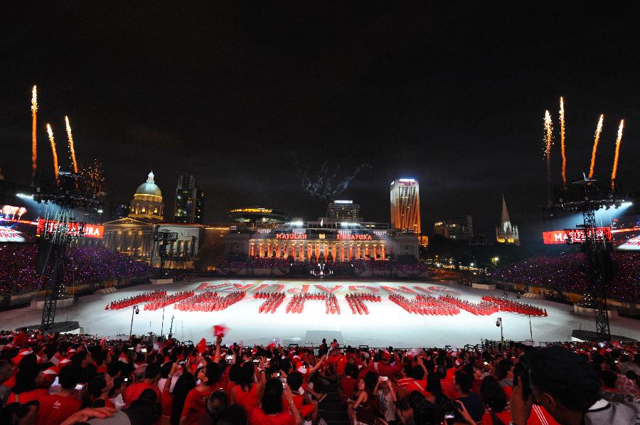 Fighter jets of Singapore's airforce fly in a formation of "50" during the celebrations of Singapore's Golden Jubilee in Singapore, on Aug. 9, 2015. Singapore celebrated its Golden Jubilee on Sunday with the biggest-ever National Day Parade (NDP), which commemorated the city state's independence. (Xinhua/Then Chih Wey) |