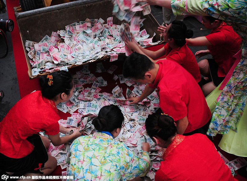 Performers count the banknotes given by tourists as gratuity after work on Aug. 9, 2015.Songcheng is a cultural theme park in Hangzhou which, along with the city's famous West Lake, has become an indispensable place to visit on the itinerary of travelers to the provincial capital of Zhejiang in eastern China. (Photo/ CFP) |
