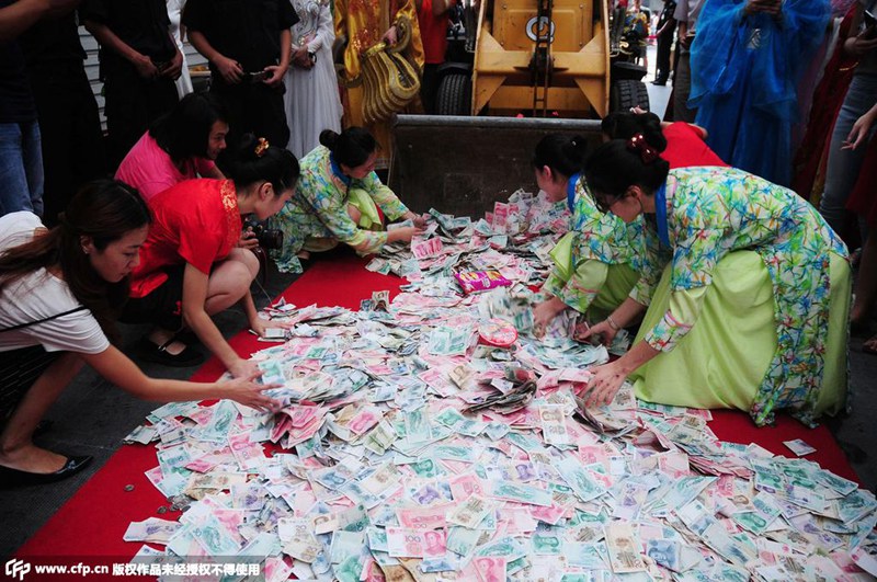 Performers count the banknotes given by tourists as gratuity after work on Aug. 9, 2015.Songcheng is a cultural theme park in Hangzhou which, along with the city's famous West Lake, has become an indispensable place to visit on the itinerary of travelers to the provincial capital of Zhejiang in eastern China. (Photo/ CFP) |