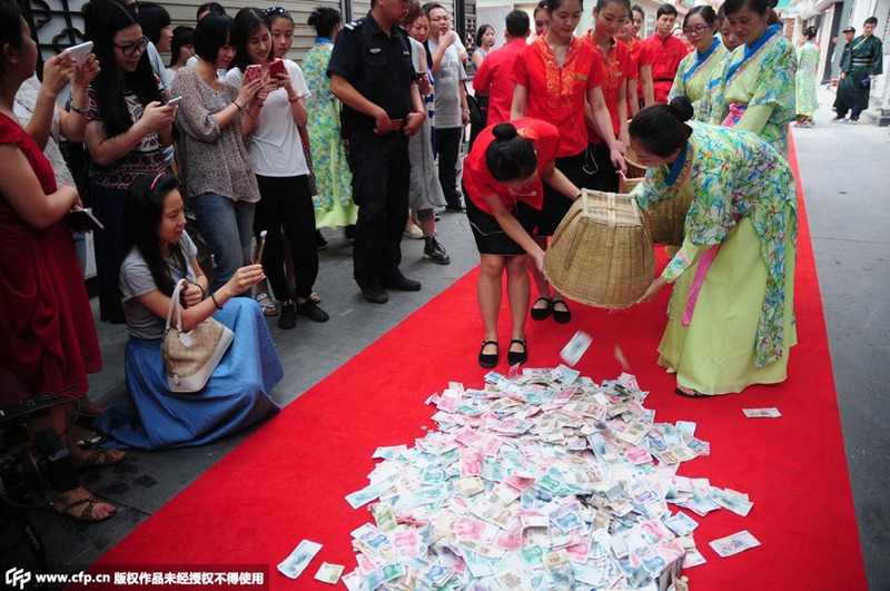 Performers wait to count money given by tourists as gratuity after work on Aug. 9, 2015. Songcheng is a cultural theme park in Hangzhou which, along with the city's famous West Lake, has become an indispensable place to visit on the itinerary of travelers to the provincial capital of Zhejiang in eastern China. (Photo/ CFP) |