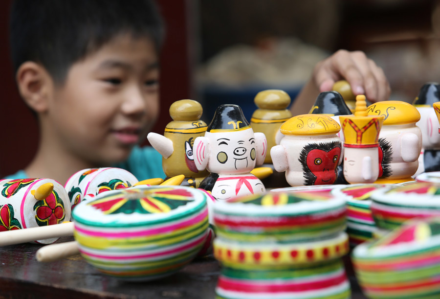 A child watches the wooden toys on Aug. 9, 2015. (Photo/Xinhua)