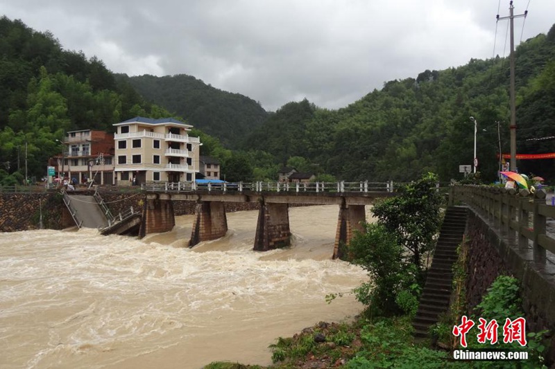 Typhoon Soudelor, the 13th this year, has left 14 people dead in the eastern Chinese cities of Wenzhou and Lishui, where heavy rains triggered mudslides and caused a bridge to collapse. (CNS/ Lin Yichi)