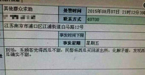 Recently, a customer called the police because the watermelon he just brought didn't taste sweet in Nanjing, east China's Jiangsu province. The police actually came to the site and helped settle the dispute.