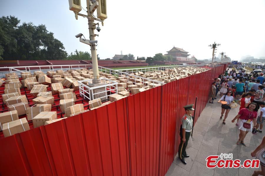 Workers build temporary platforms for people to watch a military parade from on September 3 on the flanks of Tiananmen Tower at the north of Tiananmen Square in Beijing, Aug 11, 2015. The tower is closed as an entrance to the Forbidden City during construction. China is marking the 70th anniversary of victory in the Chinese People's War of Resistance Against Japanese Aggression (1937-1945). (Photo: China News Service/Jin Shuo)