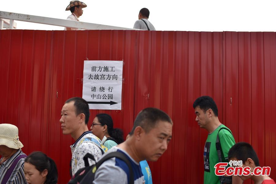Workers build temporary platforms for people to watch a military parade from on September 3 on the flanks of Tiananmen Tower at the north of Tiananmen Square in Beijing, Aug 11, 2015. The tower is closed as an entrance to the Forbidden City during construction. China is marking the 70th anniversary of victory in the Chinese People's War of Resistance Against Japanese Aggression (1937-1945). (Photo: China News Service/Jin Shuo)