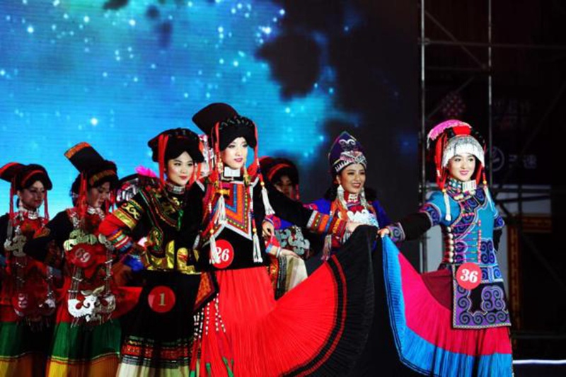 An annual traditional beauty pageant is held during the seventh international Liangshan Yi Torch Festival in Sichuan’s Yi Autonomous Prefecture on Aug. 9, 2015. Women in traditional Yi costumes performed singing and dancing at the event. (CNS/Gao Han) |