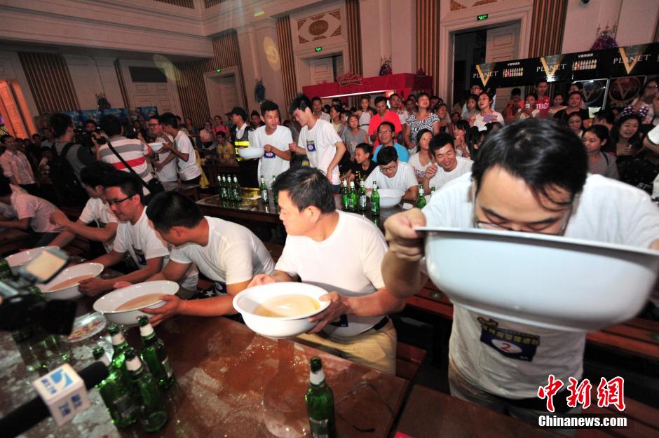 A beer drinking contest is held in Wuhan, central China's Hubei province on Aug. 9. A participant finished a big bowl of beer in 2 minutes. (CNS/Zhong Xin)