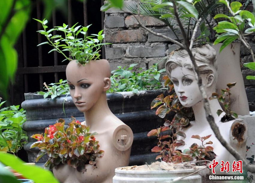 Are head shaped planters creepy to you, or do you love the look of plants that become tendrils of hair above the face of a statue? A man in Sichuan found it interesting to plant flowers inside a recycled plastic model which is a naked woman‘s bust on the rooftop of his apartment. (CNS Photo/ Zeng Meng)