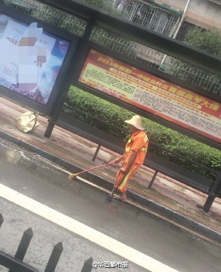 Deng Xianhuo, 69-year-old uniped sanitation worker in southwest China's Sichuan province, goes viral online. (Photo/Weibo of Huaxidushibao)