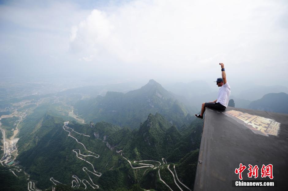 Two wingsuiters from Norway fly over Tianmenshan Mountain in central China's Zhangjiajie on Aug. 11. (CNS/Yang Huafeng)