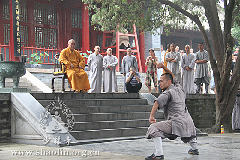 More than 20 foreigners from all over the world pay homage to Shaolin temple in Central China's Henan Province on Aug. 11. Shi Yongxing, the abbot of the Shaolin Temple received them. (Photo/Shaolin.org.cn)