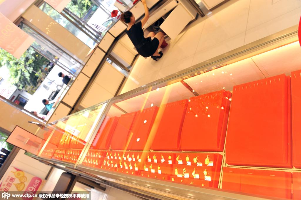 A thief broke into a jewelry store and stole jewelries, diamonds, gold, and watches worth more than 1 million yuan in Chengdu, southwest China's Sichuan province on Aug. 9, 2015.