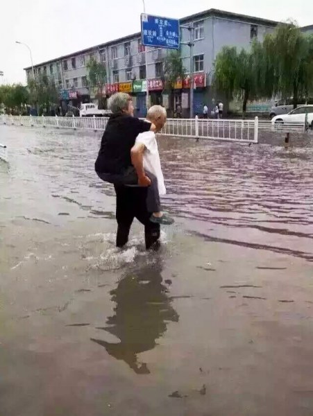 Affected by the typhoon "Soudelor", the roads in Wenzhou City of Zhejiang Province got severely flooded. A photo posted by a netizen shows that an old man carried his wife on his back to cross the road, which has touched the hearts of many people.