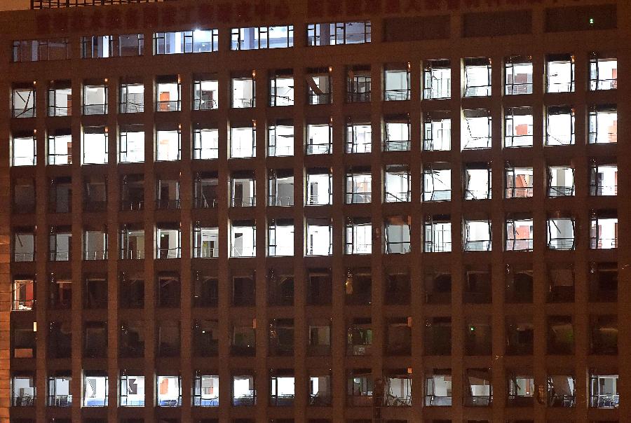Shattered windows of a nearby building are seen after an explosion in the Binhai New Area in north China's Tianjin Municipality on Aug. 13, 2015. An explosion rocked the Binhai New Area in north China's Tianjin Municipality at around 11:30 p.m. Wednesday. The cause and casualties are not immediately known. (Xinhua/Yue Yuewei) |