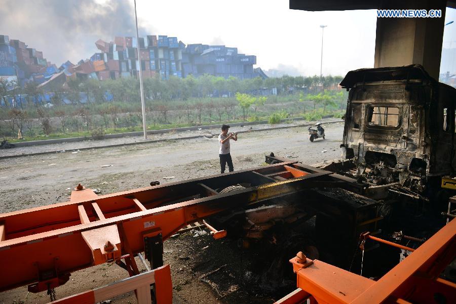 Photo taken on Aug. 13, 2015 shows a damaged vehicle under a viaduct near the site of the explosions at the Binhai new district in north China's Tianjin Municipality, Aug. 13, 2015. The death toll has climbed to 44 from two massive blasts that ripped through a warehouse in north China's port city of Tianjin as of Thursday noon, according to rescue headquarters. Twelve firefighters were among the dead. (Xinhua) |