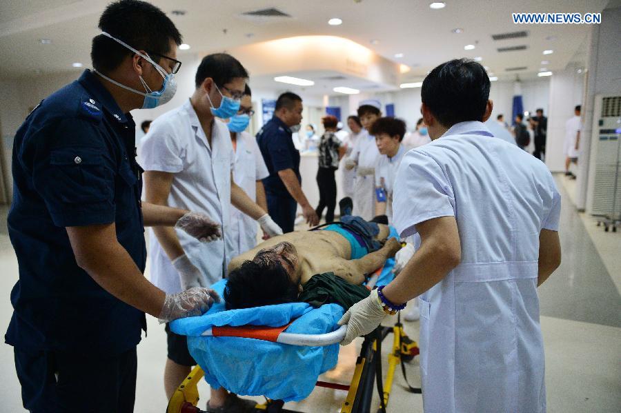 A man injured in the explosion of the Binhai new district is sent to the Tianjin Taida Hospital in north China's Tianjin Municipality, Aug. 13, 2015. The death toll has climbed to 44 from two massive blasts that ripped through a warehouse in north China's port city of Tianjin as of Thursday noon, according to rescue headquarters. Twelve firefighters were among the dead. (Xinhua) |