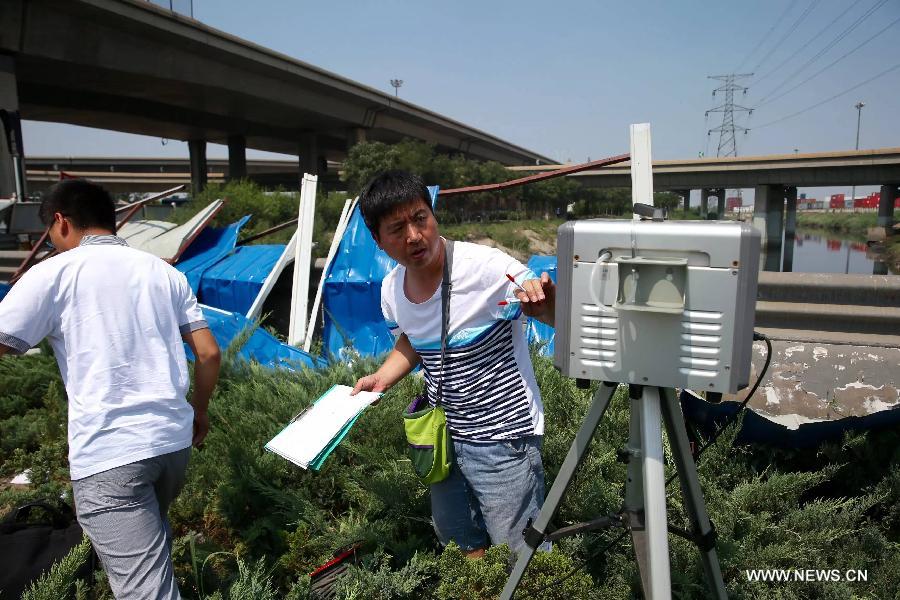 Staff members of Tianjin Environment Monitoring Center monitors air quality near the explosion site in Binhai New Area of Tianjin, north China, Aug. 13, 2015. The death toll has climbed to 44 from two massive blasts that ripped through a warehouse in north China's port city of Tianjin as of Thursday noon, according to rescue headquarters. Twelve firefighters were among the dead. (Xinhua/Jin Liwang) |