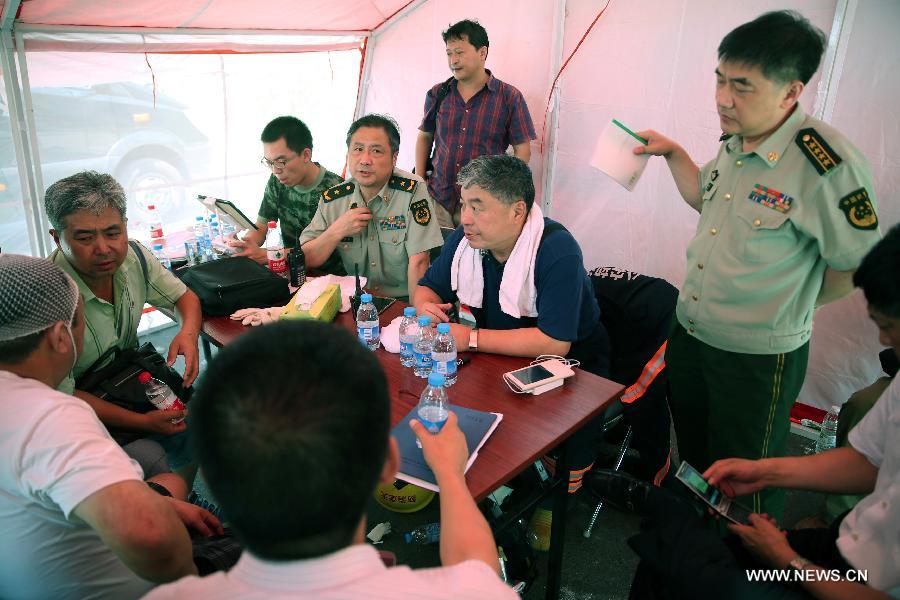 Staff members of Fire and Rescue Headquarters command rescue work near the explosion site in Binhai New Area of Tianjin, north China, Aug. 13, 2015. The death toll has climbed to 44 from two massive blasts that ripped through a warehouse in north China's port city of Tianjin as of Thursday noon, according to rescue headquarters. Twelve firefighters were among the dead. (Xinhua/Jin Liwang) |
