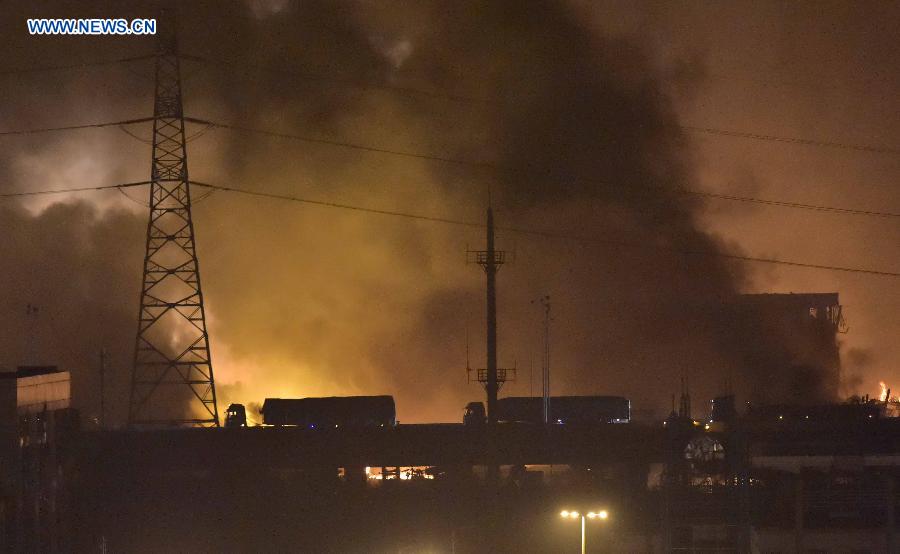 Trucks pass a bridge near the explosion site in the Binhai New Area in north China's Tianjin Municipality, Aug. 13, 2015. The death toll from a Tianjin warehouse blast Wednesday night has climbed to 17, according to rescuers. Another 32 people were critically injured and 283 people are under observation in hospital. (Xinhua/Yue Yuewei) |