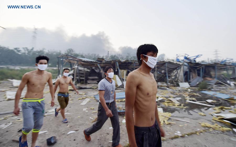 Construction workers return to damaged shanties to search for belongs near the explosion site in the Binhai New Area in north China's Tianjin Municipality, Aug. 13, 2015. The death toll from a Tianjin warehouse blast Wednesday night has climbed to 17, according to rescuers. Another 32 people were critically injured and 283 people are under observation in hospital. (Xinhua/Yue Yuewei) |