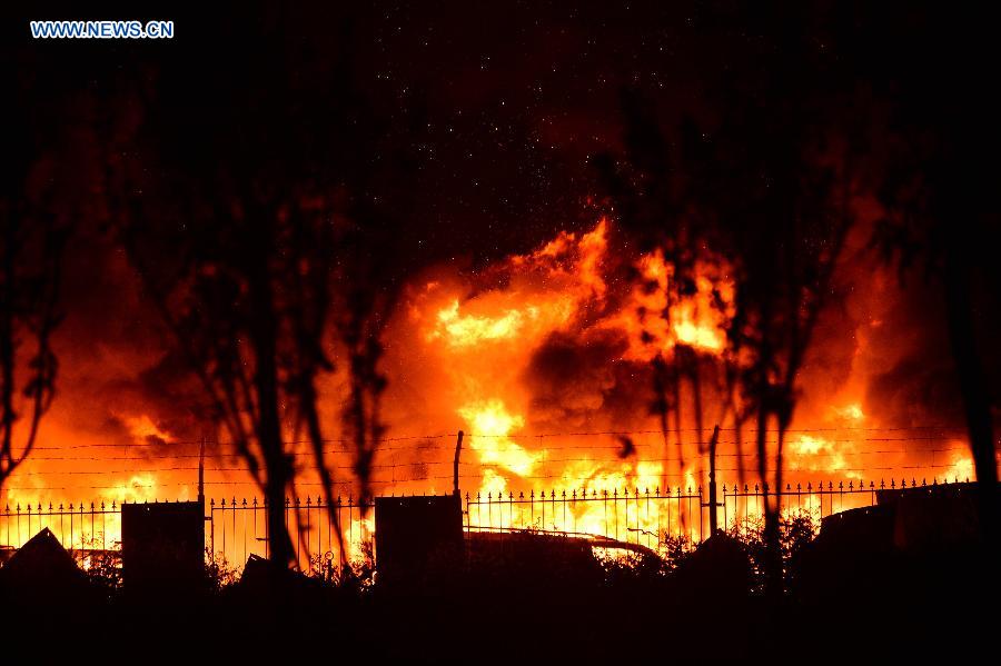 Photo taken on Aug. 13, 2015 shows the burning scene of the explosion site in the Binhai New Area in north China's Tianjin Municipality. The death toll from a Tianjin warehouse blast Wednesday night has climbed to 17, according to rescuers. Another 32 people were critically injured and 283 people are under observation in hospital. (Xinhua) |