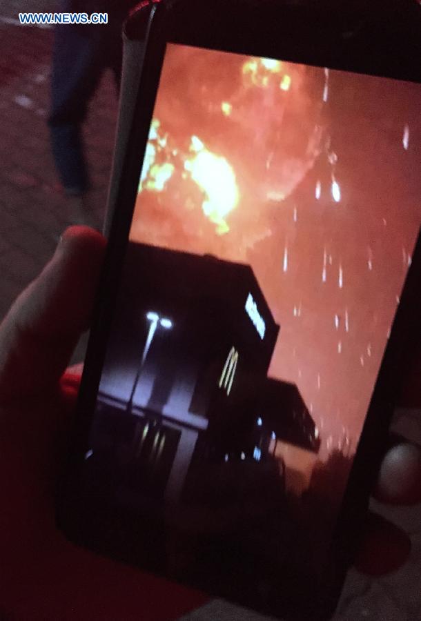 A citizen shows the photo taken during the explosion in the Binhai New Area in north China's Tianjin Municipality, Aug. 12, 2015. The death toll from a Tianjin warehouse blast Wednesday night has climbed to 17, according to rescuers. Another 32 people were critically injured and 283 people are under observation in hospital. (Xinhua) |