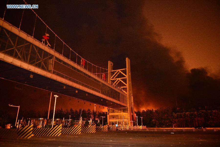 Photo taken on Aug. 13, 2015 shows smog at the explosion site in the Binhai New Area in north China's Tianjin Municipality. The death toll from a Tianjin warehouse blast Wednesday night has climbed to 17, according to rescuers. Another 32 people were critically injured and 283 people are under observation in hospital. (Xinhua) |