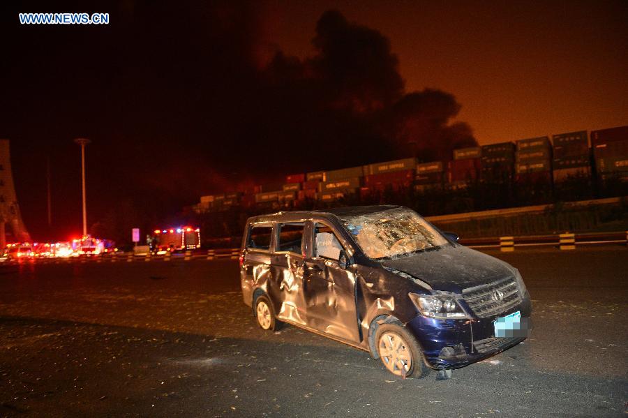 A car is damaged in the explosion in the Binhai New Area in north China's Tianjin Municipality, Aug.13, 2015. The death toll from a Tianjin warehouse blast Wednesday night has climbed to 17, according to rescuers. Another 32 people were critically injured and 283 people are under observation in hospital. (Xinhua) |