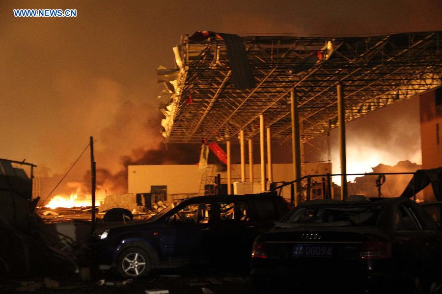 Buildings are damaged near the explosion site in the Binhai New Area in north China's Tianjin Municipality, Aug.13, 2015. The death toll from a Tianjin warehouse blast Wednesday night has climbed to 17, according to rescuers. Another 32 people were critically injured and 283 people are under observation in hospital. (Xinhua) |