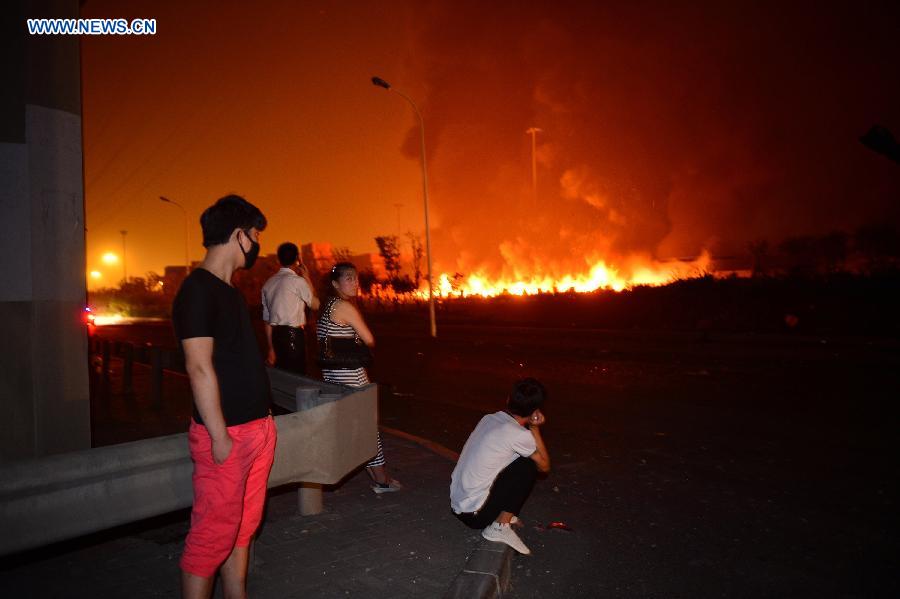 People watch the fire at the explosion site in the Binhai New Area in north China's Tianjin Municipality, Aug.13, 2015. The death toll from a Tianjin warehouse blast Wednesday night has climbed to 17, according to rescuers. Another 32 people were critically injured and 283 people are under observation in hospital. (Xinhua) |