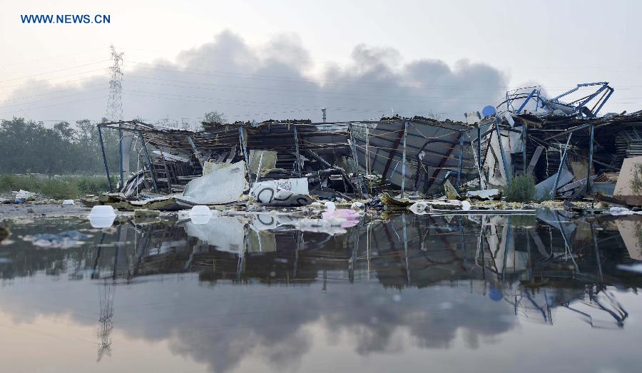 Shanties are damaged at a construction site near the explosion site in the Binhai New Area in north China's Tianjin Municipality, Aug.13, 2015. The death toll from a Tianjin warehouse blast Wednesday night has climbed to 17, according to rescuers. Another 32 people were critically injured and 283 people are under observation in hospital. (Xinhua/Yue Yuewei) |