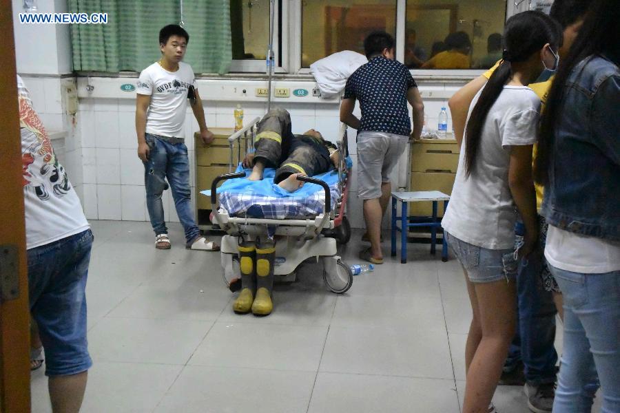 Injured people receive treatment at a hospital in north China's Tianjin Municipality, Aug. 13, 2015. A series of massive explosions ripped through a warehouse storing dangerous goods in the Binhai New Area in northeastern China's Tianjin municipality at around 11:20 p.m. Wednesday, killing at least 17 and injuring more than 400. (Xinhua/Zhang Chenlin) |