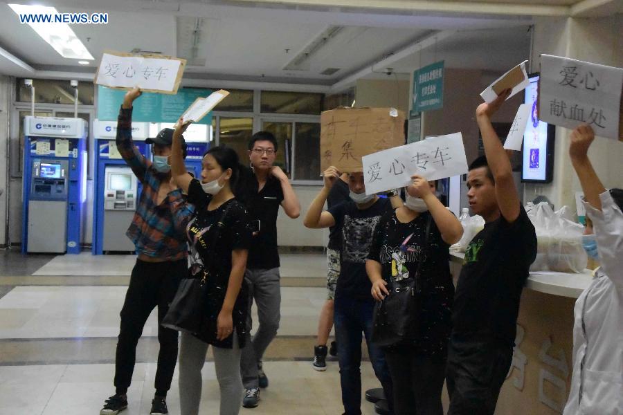 Volunteers offer help at a hospital in north China's Tianjin Municipality, Aug. 13, 2015. A series of massive explosions ripped through a warehouse storing dangerous goods in the Binhai New Area in northeastern China's Tianjin municipality at around 11:20 p.m. Wednesday, killing at least 17 and injuring more than 400. (Xinhua/Zhang Chenlin) |