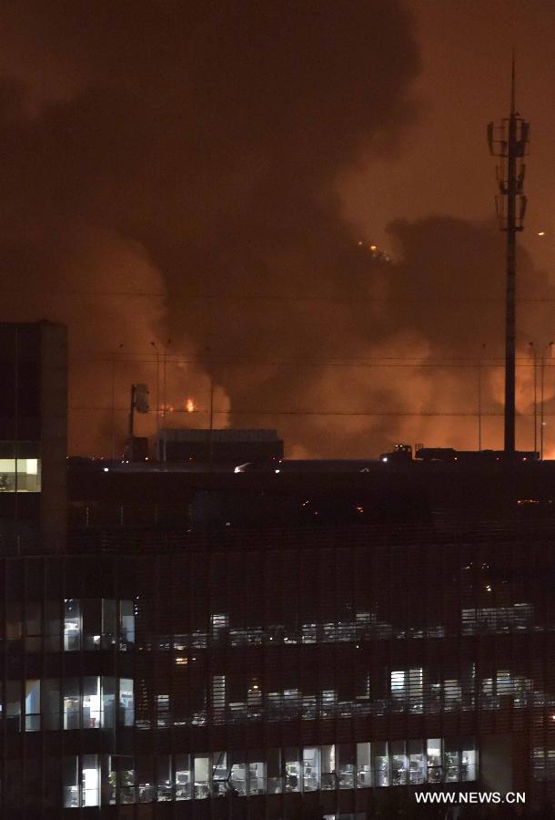 Photo taken on Aug. 13, 2015 shows the site of the explosions in the Binhai New Area in north China's Tianjin Municipality. A series of explosions at a warehouse for dangerous goods in north China's Tianjin Municipality killed at least 17 people. Another 32 people were critically injured and 283 people are under observation in hospital. (Xinhua/Yue Yuewei)