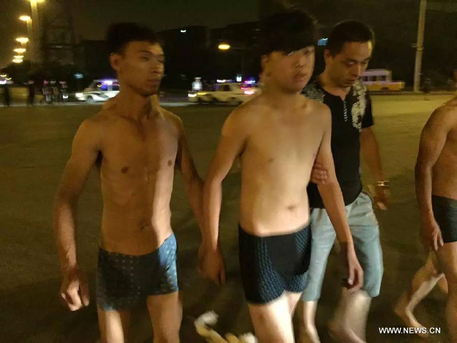 People evacuate from the site of the explosions in the Binhai New Area in north China's Tianjin Municipality, Aug. 13, 2015. A series of explosions at a warehouse for dangerous goods in north China's Tianjin Municipality killed at least 17 people. Another 32 people were critically injured and 283 people are under observation in hospital. (Xinhua/Yue Yuewei)